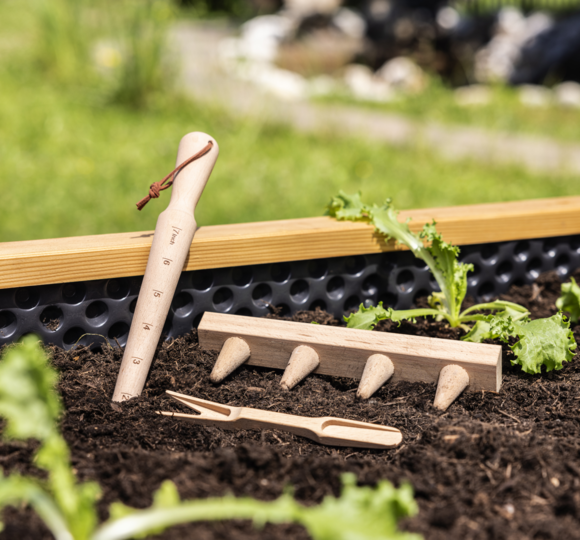 Um die empfindlichen Setzlinge schließlich wurzelschonend umpflanzen zu können, kommt die Pikiergabel zum Einsatz. Zudem kann mit der zweiten Seite der Pikiergabel vorsichtig Erde in die zuvor geschaffenen Löcher gefüllt und leicht angedrückt werden.