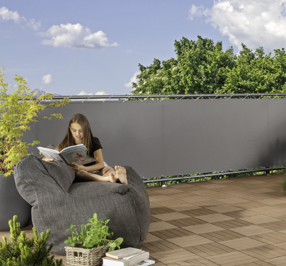 Die Ruheoase auf 6 m² – unser geliebtes Balkonien. Hier sollen fremde Blicke den Kaffee-und-Kuchen-Genuss nicht stören. Geschweige denn die nackten Knie beäugen. Balkonblende muss her. Eine gute!