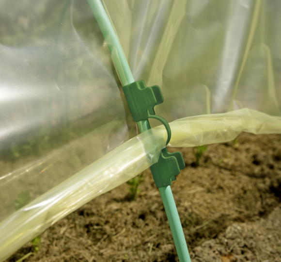 Mit den Befestigungs- und Halteclips wird die Abdeckung an Tunnelbögen befestigt. Das Besondere daran ist, dass jeder Verbinder 2 Klammern hat und die Folie einfach aufgerollt und unkompliziert zwischen den beiden Klammern fixiert werden kann. Um zum Beispiel zu gießen, muss die Abdeckung weder komplett entfernt noch hochgehalten werden.