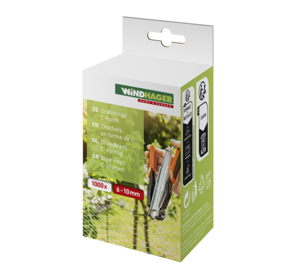 Passendes Zubehörmaterial für die Zaunringzange. Die verzinkten C-Drahtringe kommen in der 1.000-Stück-Verpackung und sind die ideale Ergänzung zum Verbinden von Gittern und Geflechten aller Art.