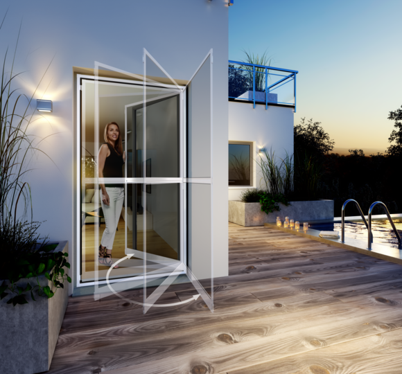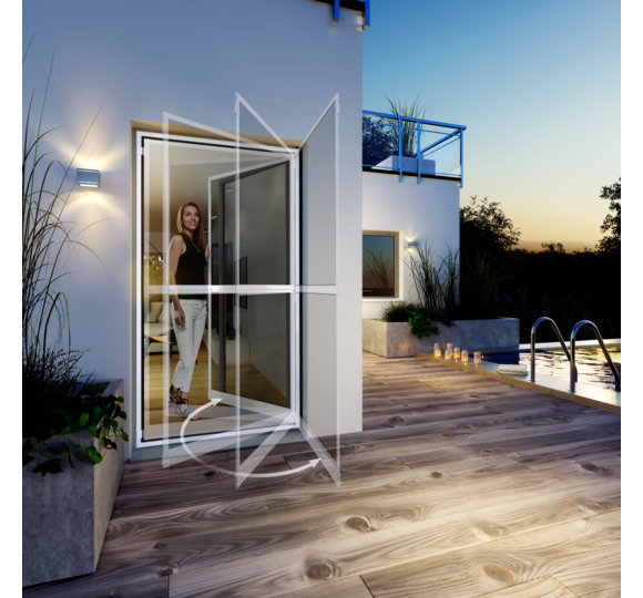 Für die Stabilität der Fliegengitter Pendeltür sorgt ein Rahmen aus robusten, pulverbeschichteten Aluminiumprofilen und eine Mittelsprosse. Abgeschrägte Kanten verleihen dem Ganzen eine softere Optik und Haptik. Ein robustes Trittblech schützt das Gewebe und ermöglicht es, die Tür von beiden Seiten mit dem Fuß aufzustoßen. Per Hand lässt sich die Tür an der durchgängigen Griffleiste öffnen. Dank fast unsichtbarem „Perfect View“ Fiberglasgewebe in anthrazit bewahrt man sich einen freien Blick nach draußen. Frischluft und Licht kommen durch, Mücken bleibt der Zugang versperrt. Umlaufende Dichtungsbürsten schließen auch die letzte Lücke zur Mauer hin und schützen selbst vor kleinsten Insekten. Befestigt wird der Insektenschutz am Türrahmen. Solide, glasfaserverstärkte Scharniere sorgen dafür, dass die Pendeltüre in beide Richtungen schwingt und sich von alleine schließt; Magnete halten sie sicher geschlossen.