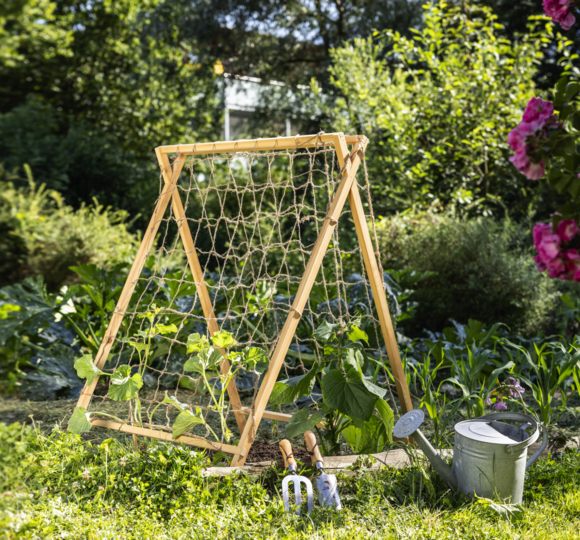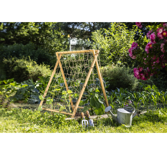 Das freistehende Rankgerüst aus FSC-zertifiziertem Kiefernholz ist der praktische Helfer für jedes Gemüsebeet. Es kann ganz einfach selbst aufgebaut werden und gibt hochwachsenden Gemüsepflanzen stabilen Halt. Stäbe zusammenschrauben, Schnur oder Ranknetz (separat erhältlich) zwischen ihnen spannen, fertig.