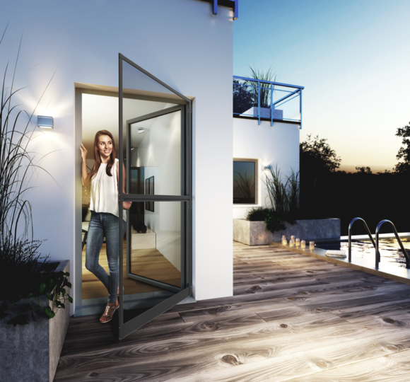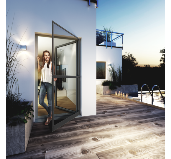 - TÜR SCHWINGT NACH AUSSEN AUF – von beiden Seiten zu öffnen/schließen; mit durchgehender Griffschiene und trittfestem Stoßblech aus Aluminium.