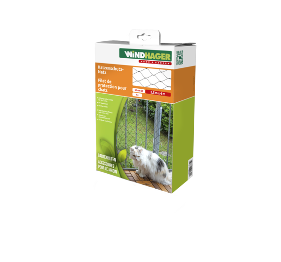 Widerstandfähiges Netz aus HDPE-Gewebe zum Schutz der Wohnungskatze vor Absturz von Balkonen, Fenstern, Verandas etc. Das Netz bietet Schutz bei Ablenkung durch vorbeifliegende Vögel oder beim Klettern.