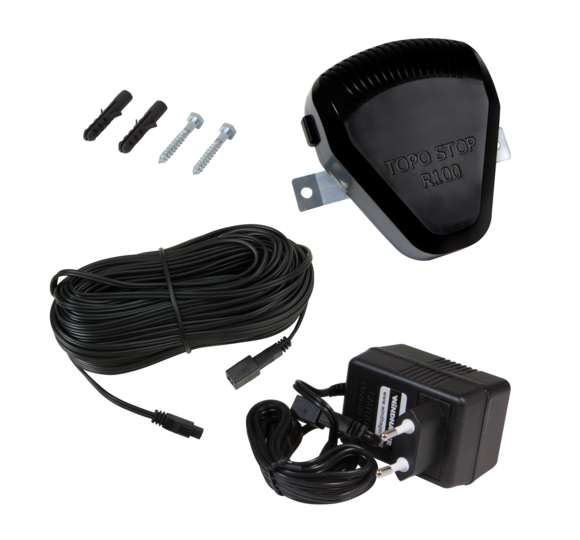 Der Mäusevertreiber ist standardmäßig mit separatem Netzstecker und einem 20 m Kabel ausgestattet, sodass er frei platziert werden kann. Ein passendes 20 m Verbindungs- und Verlängerungskabel (08020) ist separat erhältlich. Sollte mehr als ein Gerät nötig sein, um die Mäuse fernzuhalten, können zwei TOPO STOP R100 miteinander verbunden werden und mit einem einzigen Netzadapter angeschlossen werden.