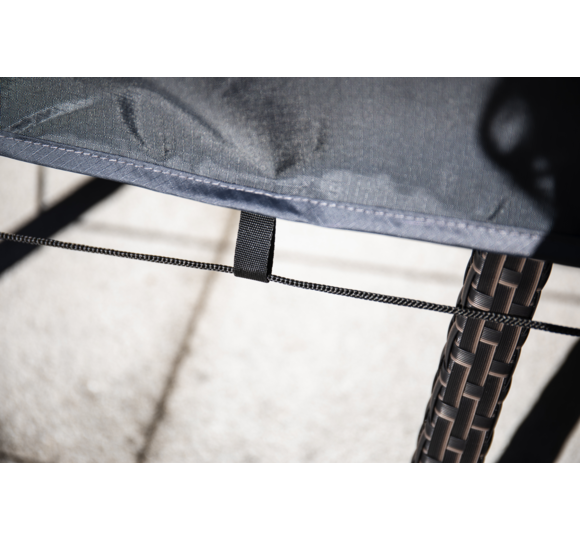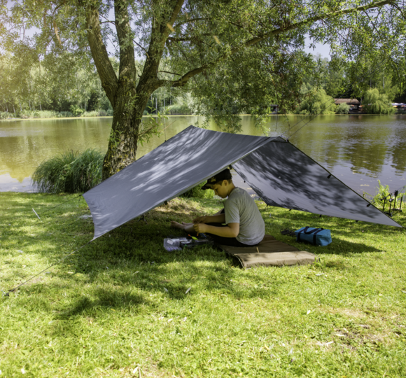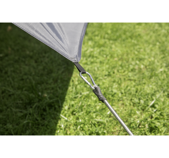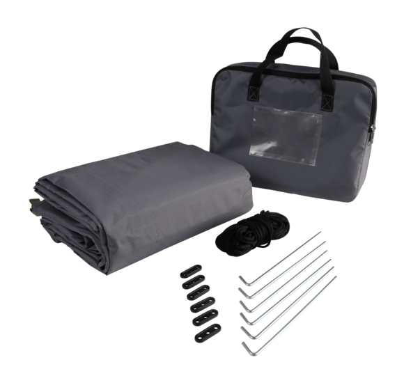 Die Plane ist mit Befestigungsschlaufen und einer Befestigungsschnur ausgestattet. Damit die Länge der Schnur individuell angepasst werden kann, sind im Set zehn Stück Leinenspanner enthalten. So ist sie direkt einsatzbereit und kann mit den mitgelieferten Heringen auch im Boden verankert werden.
