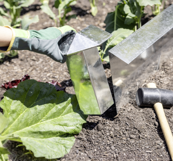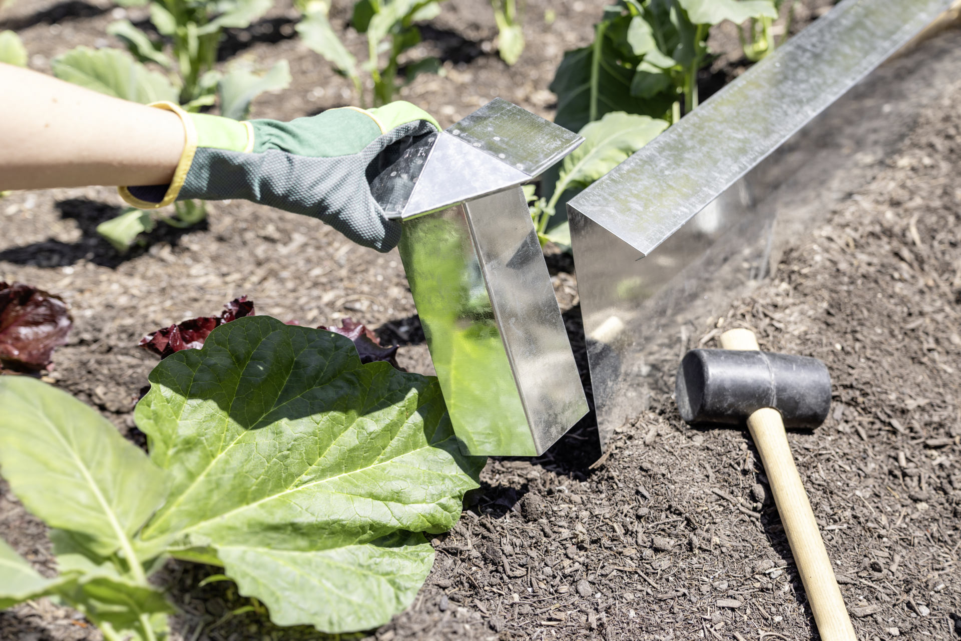 Anwendung: Ziehen Sie sich zur Montage immer Handschuhe an, um die Verletzungsgefahr durch die scharfen Kanten zu verringern. Für einen vollständigen Schneckenzaun werden zusätzlich zu vier Schneckenzaun-Ecken noch Wandteile und Befestigungsklammern benötigt. Anschließend können die Ecken mit den Wandteilen zusammengesteckt werden. Um den Schneckenzaun am Beet oder Hochbeet zu fixieren, müssen die Elemente mit den Befestigungsklammern in der Erde verankert werden.