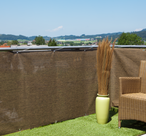 Die Blende bildet einen dezenten, aber edlen Hintergrund für den Balkon. Die gedeckten Farben passen zu allen Balkonmöbeln und bilden eine schöne Kulisse für Balkonpflanzen und Dekoration. Die Sichtschutzmatte ist aus hochwertigem Kunststoff-Verbundgewebe, bei dem die Schnittkanten nicht ausfransen.