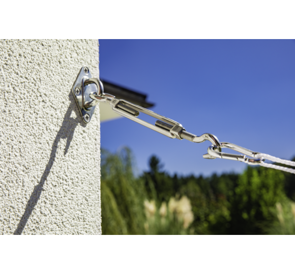 Das Befestigungsset beinhaltet mit 2 Spannankern, 2 Karabinerhaken und 4 Halteösen alles, was Sie zum Einspannen des Sonnensegels brauchen.