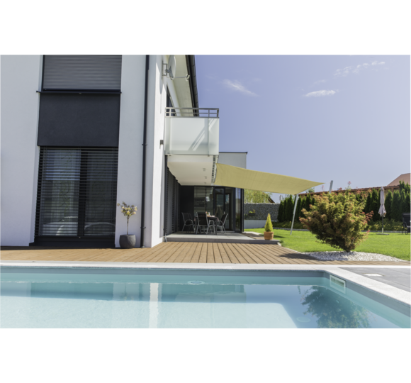 Angenehme Beschattung durch Sonnensegel hat außerdem den Vorteil, dass kein kostbarer Platz als Stellfläche verloren geht, wie bei einem Sonnenschirm. Und im Winter kann das Sonnendach einfach abgenommen und absolut platzsparend verstaut werden.