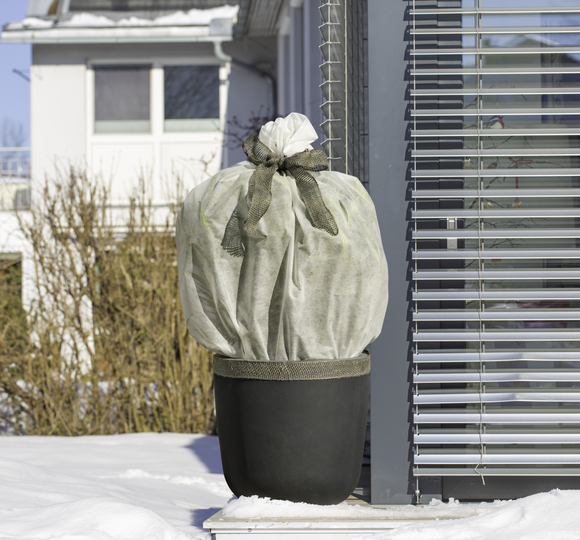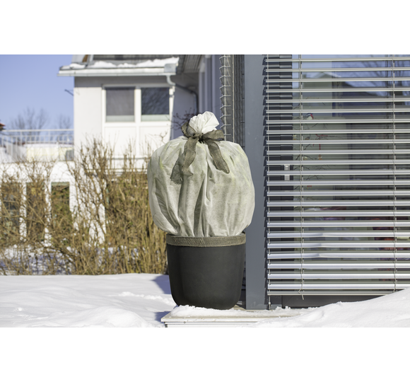 Ein Wintervlies hilft dabei, Topfpflanzen, (Jung-)Bäume und Sträucher im Garten während der kalten Jahreszeit vor Frost und Wind zu schützen. Im späten Herbst, kurz bevor der Winter einkehrt, gilt es die Pflanzen gut einzupacken. Zweige und sperrige Pflanzen können, vor dem Umwickeln mit dem Wintervlies, mit einer Schnur, wie zum Beispiel dem Kokos-Baumanbinder von Windhager, zusammengebunden werden. Danach klappt das Umwickeln mit dem Wintervlies schnell und unkompliziert. Achten Sie darauf, dass die gesamte Pflanze bedeckt ist und keine Zweige oder Blätter mehr sichtbar sind. Für optimalen Schutz sollte das Vlies mehrmals um die gesamte Pflanze gewickelt werden. Befestigen Sie das Wintervlies anschließend zum Beispiel mit einer Bindeschnur, damit die Pflanzen den ganzen Winter über zuverlässig geschützt bleiben. Passendes Bindezubehör finden Sie ebenfalls im Windhager-Sortiment. Bei Kübelpflanzen sollte auch der Topf geschützt werden. Das funktioniert schnell und unkompliziert mit einem Windhager-Topfschutz. Für rundum gut geschützte Pflanzen können Sie den Topf zusätzlich auf eine Topfunterlage stellen.