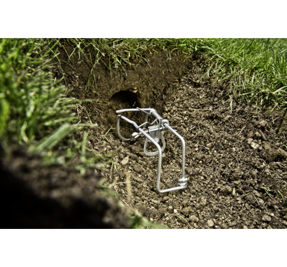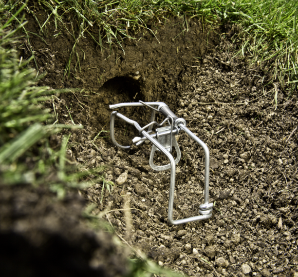 Nachdem ein Wühlmausgang ausfindig gemacht wurde, muss die Falle nur noch platziert werden. Die Falle BRACKET sollte ungefähr 10 cm unter der Erdoberfläche gesetzt werden. Danach muss das Loch wieder verdeckt werden. Hierfür eignet sich beispielsweise die zuvor entfernte Grasnarbe oder ein Eimer. Zusätzlich kann die Stelle an der sich die Falle befindet mit einer Markierflagge (Art.-Nr. 05317) gekennzeichnet werden. So lässt sich die Wühlmausfalle danach wieder leichter finden.