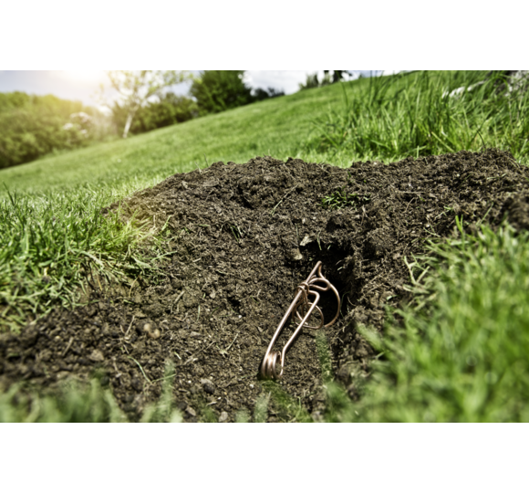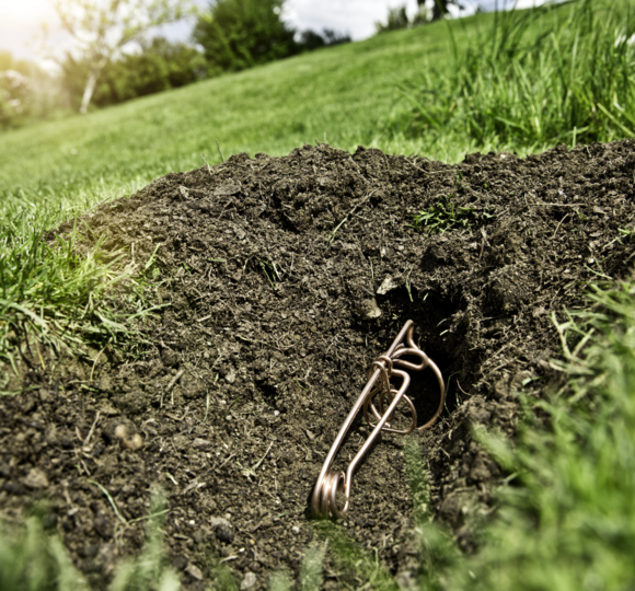 Nachdem ein Wühlmausgang ausfindig gemacht wurde, muss die Falle nur noch platziert werden. Bei Bedarf kann vorher ein Stück Obst oder Gemüse als Köder angebracht werden. Die Falle CLASSIC sollte ungefähr 10 cm unter der Erdoberfläche gesetzt werden. Danach muss das Loch wieder verdeckt werden. Hierfür eignet sich beispielsweise die zuvor entfernte Grasnarbe oder ein Eimer. Zusätzlich kann die Stelle an der sich die Falle befindet mit einer Markierflagge (Art.-Nr. 05317) gekennzeichnet werden. So lässt sich die Wühlmausfalle danach wieder leichter finden.