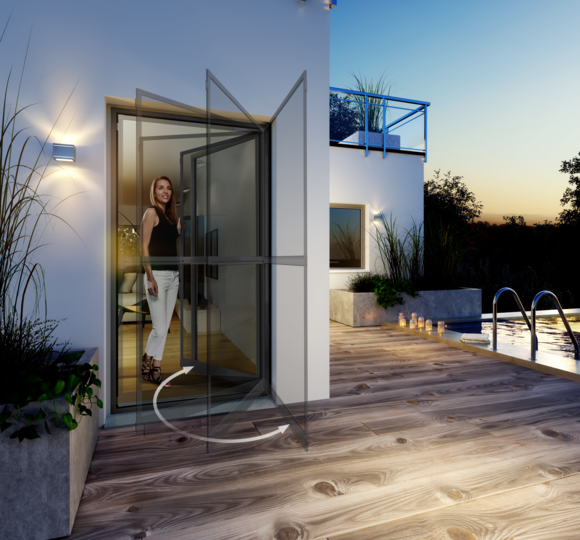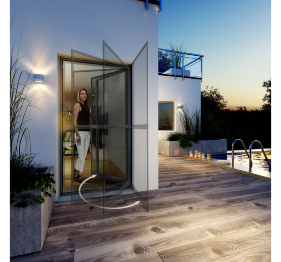 • SELBSTSCHLIESSEND – Die Tür schwingt nach dem Durchgehen von selbst in ihre Ausgangsposition zurück. Magnete halten sie geschlossen.