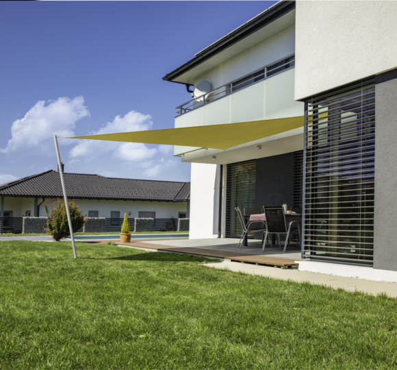 Wohltuender Schatten auf Terrasse, Balkon und im Garten wird mit steigenden Temperaturen immer wichtiger. Eine praktische Lösung hierfür sind Sonnensegel. Sie sind schnell und leicht zu befestigen, im Vergleich zu einer Pergola oder ähnlichem kostengünstig und können jederzeit wieder abgenommen werden. Sind die Verankerungen erst einmal angebracht, kann jederzeit ein Sonnensegel in einer anderen Farbe gespannt werden – für einen völlig neuen Look. Die gebrochenen Farben haben außerdem den Vorteil, dass sie – im Gegensatz zu z. B. rein weiß – bei extremer Sonneneinstrahlung nicht blenden.