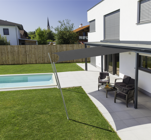 Angenehme Beschattung durch Sonnensegel hat außerdem den Vorteil, dass kein kostbarer Platz als Stellfläche verloren geht, wie bei einem Sonnenschirm. Und im Winter kann das Sonnendach einfach abgenommen und absolut platzsparend verstaut werden. Sonnensegel eignen sich nicht nur für Terrassen, auch am Balkon, auf der Wiese, über dem Pool oder der Sandkiste lässt sich so ein tolles Sonnendach zaubern. Einzige Voraussetzung: das Segel muss an 4 Punkten befestigt werden können.